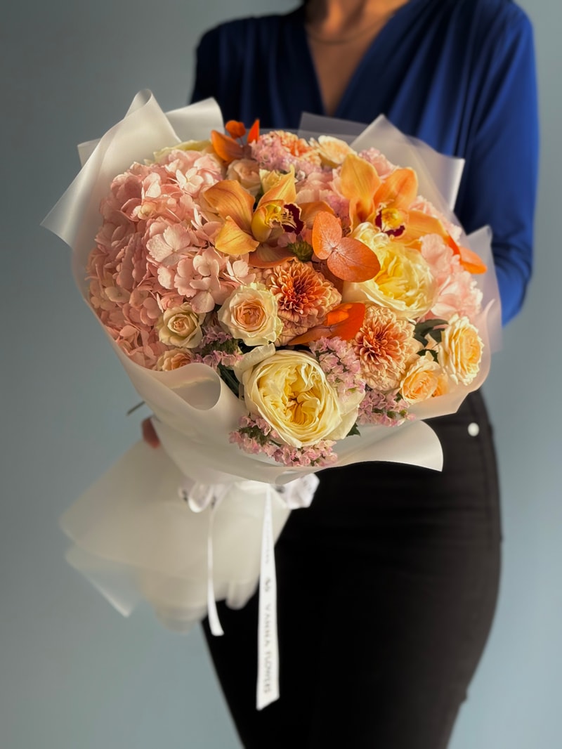 Apricot Bloom, baharın sıcak ve aydınlık tonlarını bir araya getiren özel bir tasarımdır. Şeftali tonlu orkide dokunuşları, krem bahçe gülleri, yumuşak pudra ortanca ve dokulu tamamlayıcı çiçeklerle hazırlanır. Renk geçişleri sayesinde hem romantik hem de enerjik bir görünüm sunar.