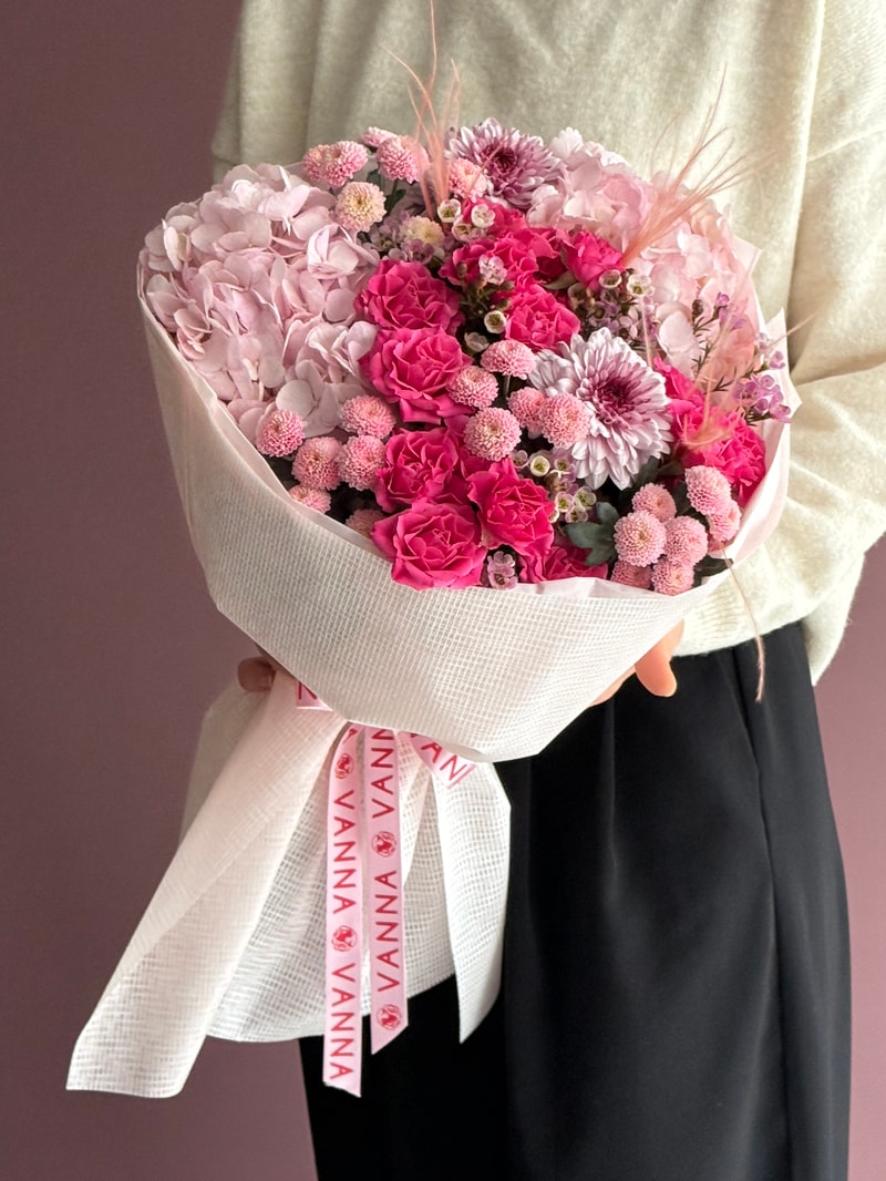Candy Bloom, pembe tonların en canlı ve en “neşeli” halini taşıyan premium bir buket. Pudra pembe ortanca hacmi yumuşatırken, fuşya sprey güller bukete güçlü bir vurgu katar. Pembe santiniler (ponpon krizantem) ve mini dokunuşlar (waxflower) ile couture bir doku oluşur. Hem romantik hem enerjik — doğum günü, “iyi ki varsın”, kutlama ve sürpriz anları için çok iddialı.