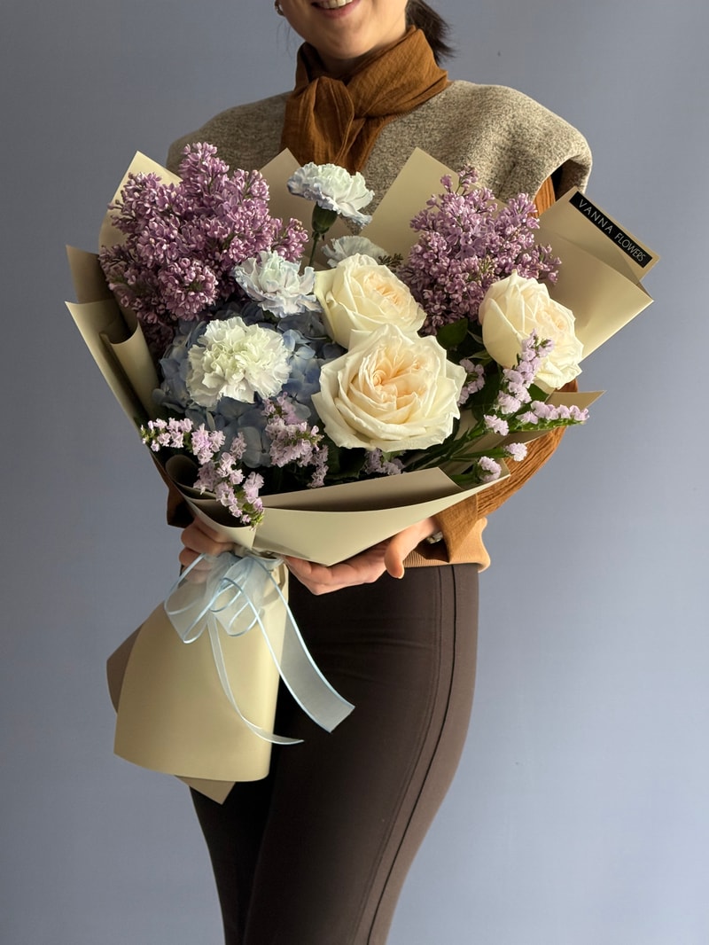 Lilac & Ivory Serenity, baharın en zarif tonlarını tek bir bukette toplar. Leylakların kokulu ve hacimli yapısı, mavi ortancanın yumuşak dokusuyla dengelenir; krem güller ise kompozisyona zamansız bir şıklık katar. Beyaz karanfiller ve lila statice dokunuşları buketi daha da katmanlı ve fotojenik hale getirir. Sonuç: ferahlık hissi veren, modern ve zarif bir Vanna Flowers tasarımı.