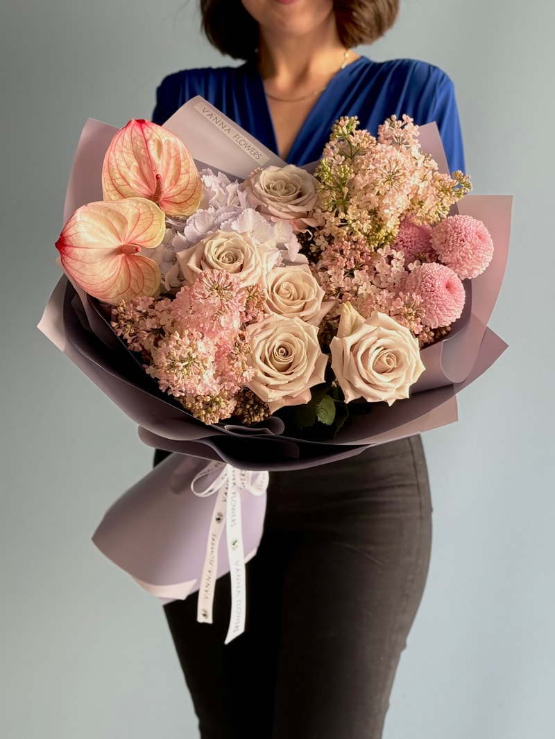 Mauve Poise, baharın en yumuşak tonlarını sofistike bir çizgide buluşturan özel bir tasarımdır. Pudra pembe leylakların romantik dokusu, nude güllerin sakin asaleti ve anthuriumun modern vurgusuyla dengelenir. Lila ambalajla tamamlanan görünüm, bukete hem ferah hem de seçkin bir karakter kazandırır.