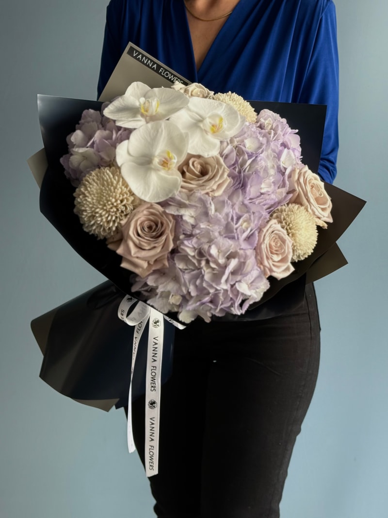 Midnight Lilac, yumuşak pastel tonları daha güçlü bir çerçevede sunan özel bir tasarımdır. Lila ortancanın hacimli dokusu, nude güllerin sakin zarafeti ve beyaz orkidenin asil görünümüyle dengelenir. Siyah ambalaj ise tüm kompozisyona modern, çarpıcı ve premium bir karakter kazandırır.