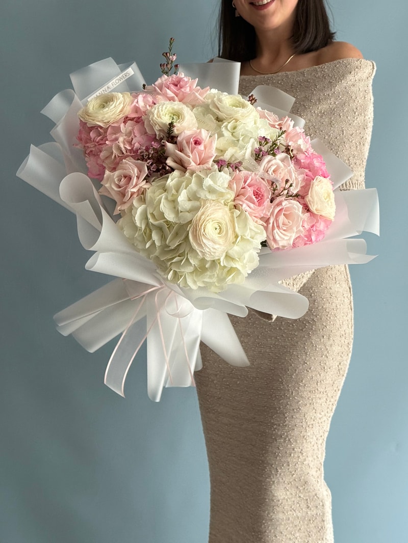Pastel Bride, yumuşak pembe ve ivory tonlarını, dolgun ortanca dokusuyla bir araya getiren “soft luxury” bir tasarımdır. Krem ranunkuluslar kompozisyona ipeksi bir katman eklerken, pudra pembe güller romantik bir çizgi yaratır. İnce waxflower detayları buketi zenginleştirir; beyaz premium ambalaj ve pembe kurdele ise tüm görünümü modern ve zarif bir çerçeveye taşır.