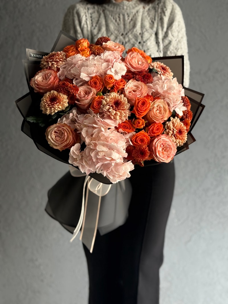 Sunset Noir, gün batımının sıcak tonlarını premium bir kompozisyonda bir araya getirir. Pudra/şeftali ortancaların dolgun hacmi, şeftali garden güllerin zarif formuyla yumuşarken; turuncu sprey güller bukete enerjik bir ritim katar. Tarçın tonlarındaki krizantem dokunuşları tasarıma derinlik ve karakter verir. Siyah couture ambalaj ise tüm renkleri çarpıcı bir çerçeve gibi sarar—tek bakışta “wow” etkisi.