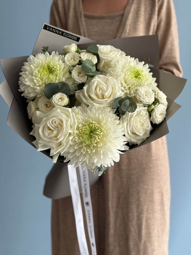 White Echo, sadeliğin içindeki zarafeti öne çıkaran özel bir tasarımdır. Beyaz güllerin klasik duruşu, beyaz sprey güllerin yumuşak dokusu ve yeşil merkezli krizantemlerin ferah görünümüyle dengelenir. Okaliptüs detayları ise bukete doğal ve modern bir hareket kazandırır.