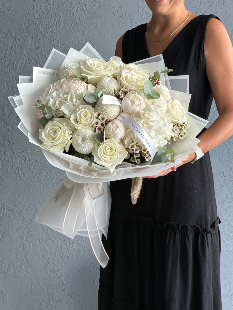 Beyaz Zarafet, söz ve nişan merasimlerinin en özel anlarına eşlik etmek üzere tasarlanmış, aydınlık ve seçkin bir bukettir. Beyaz güller, ortancalar, şakayık dokuları, krizantem ve tamamlayıcı çiçekler bir araya gelerek ferah, temiz ve rafine bir görünüm oluşturur.