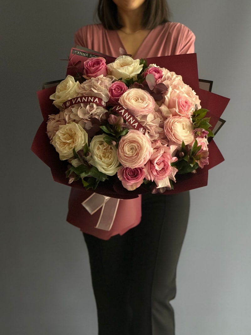 Bordeaux Romance, bordo ambalajın sofistike kontrastını; pudra ve krem tonların yumuşak romantizmiyle buluşturan, hacmi yüksek premium bir bukettir. Ortancanın bulut gibi dolgun dokusu kompozisyona zarafet katarken, ranunkulusların ipeksi katmanları ve garden güllerin şık formu tasarımı couture bir seviyeye taşır. Özel günler için unutulmaz, tebrikler için ise “güvenli ama etkileyici” bir tercihtir.