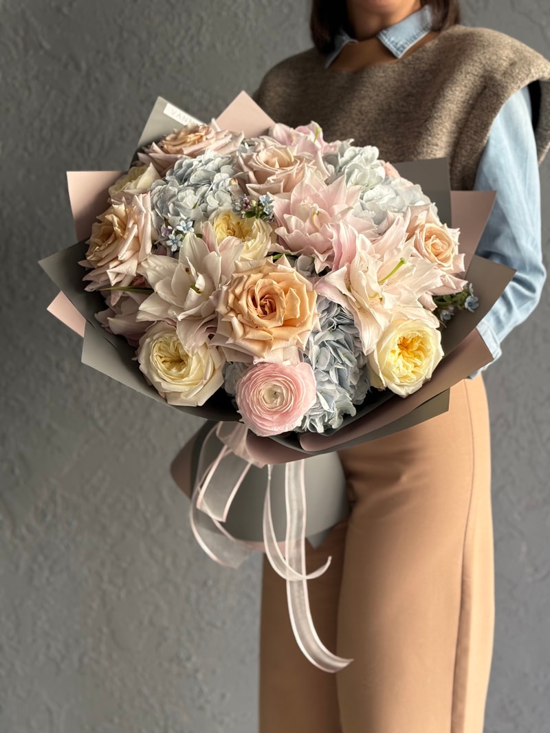 Champagne Cloud, pastel tonların en rafine yorumu. Pudra mavi ortancanın bulut gibi hacmi; şampanya ve vanilya tonlarındaki güllerle yumuşar. Beyaz lilyumların zarif açılışı bukete ışık ve ihtişam katarken, krem garden gül ve pembe ranunkulus dokuyu zenginleştirir. Minik mavi çiçek dokunuşları kompozisyona taze bir “sky” hissi verir. Premium ambalaj ve ince kurdele ile tamamlanan bu tasarım; sakin bir lüks arayanlara.