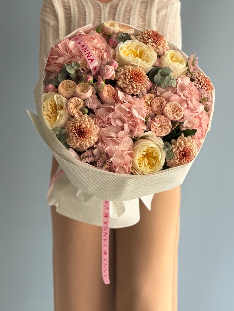 Lâl Bahçesi, söz ve nişan merasimlerinin sıcak ve özenli atmosferine eşlik etmek üzere tasarlanmış, romantik ve dengeli bir bukettir. Pudra tonlu ortancalar, ekru bahçe gülleri, zarif sprey güller ve dokulu krizantemler bir araya gelerek yumuşak ama dolgun bir görünüm oluşturur.
