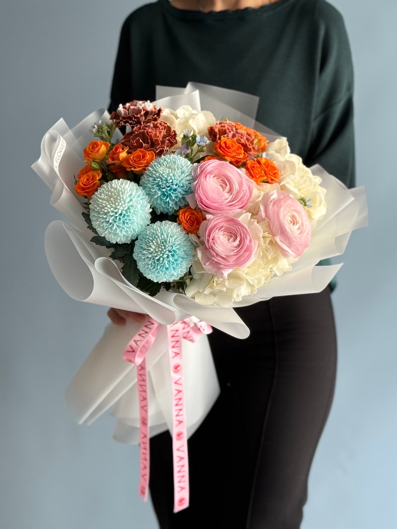 Pastel Marmalade, yumuşak pastel tonlarla canlı renk vurgularını aynı kompozisyonda buluşturan özel bir tasarımdır. Mavi krizantemlerin ferah etkisi, turuncu sprey güllerin enerjisi ve pudra ranunkulusların zarif dokusuyla dengelenir. Krem ortanca ise bukete hacimli ve sofistike bir görünüm kazandırır.