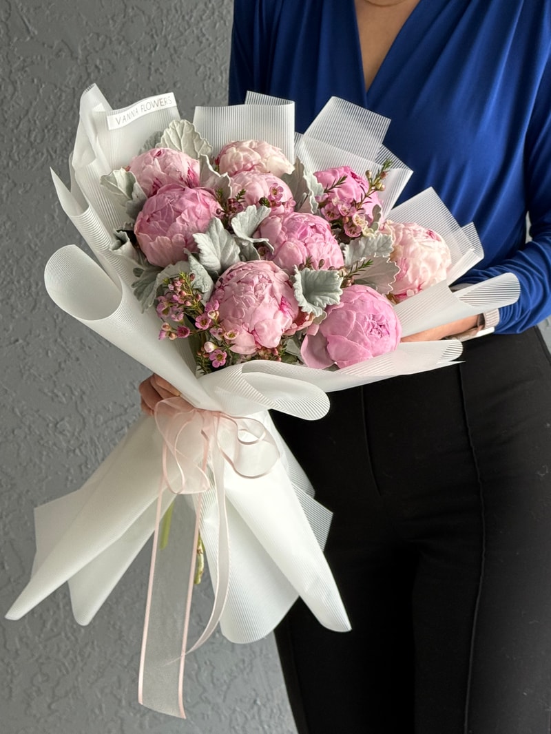 Peony Mist, pembe şakayıkların dolgun ve yumuşak dokusunu, gümüş tonlu yaprakların (dusty miller) modern çizgisiyle buluşturan imza bir tasarımdır. Waxflower dokunuşları bukete ince bir detay zenginliği katar; sonuç “romantik ama keskin”, sakin ama iddialı bir görünüm. Beyaz çizgili ambalaj, kompozisyonun couture karakterini tamamlar.