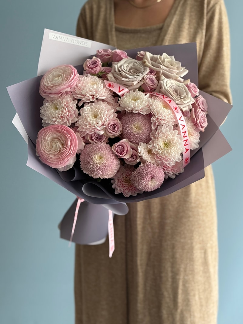 Porcelain Bloom, baharın en yumuşak tonlarını rafine bir çizgide buluşturan özel bir tasarımdır. Pudra ranunkulusların katmanlı dokusu, mini güllerin romantik görünümü ve pastel krizantemlerin yumuşak hacmiyle dengelenir. Lila ambalaj ise bukete sakin, modern ve seçkin bir karakter kazandırır.