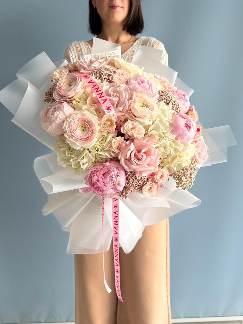 Pudra Ahenk, söz ve nişan törenlerinin romantik ve seçkin atmosferine eşlik etmek üzere tasarlanmış özel bir bukettir. Pudra pembe şakayıklar, ekru ortancalar, ranunkuluslar, güller ve zarif sprey güller bir araya gelerek yumuşak ama etkileyici bir görünüm oluşturur.
