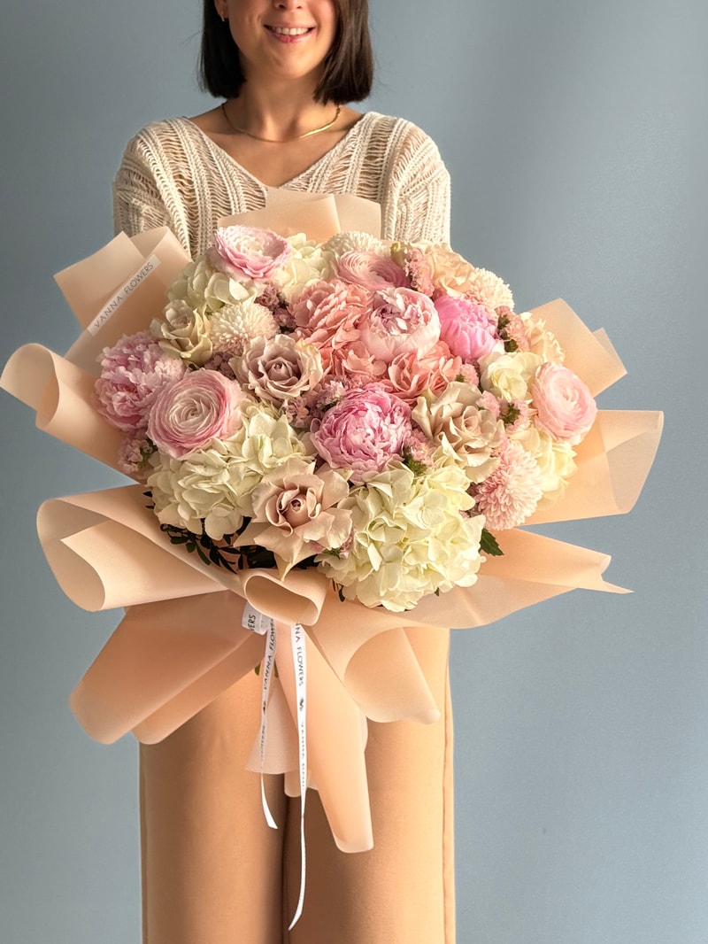 Zarif Vuslat, söz ve nişan törenlerinin sade ama etkileyici atmosferine eşlik etmek üzere tasarlanmış özel bir bukettir. Pudra pembe şakayıklar, ekru ortancalar, ranunkuluslar ve yumuşak tonlu güller bir araya gelerek romantik, huzurlu ve seçkin bir görünüm oluşturur.